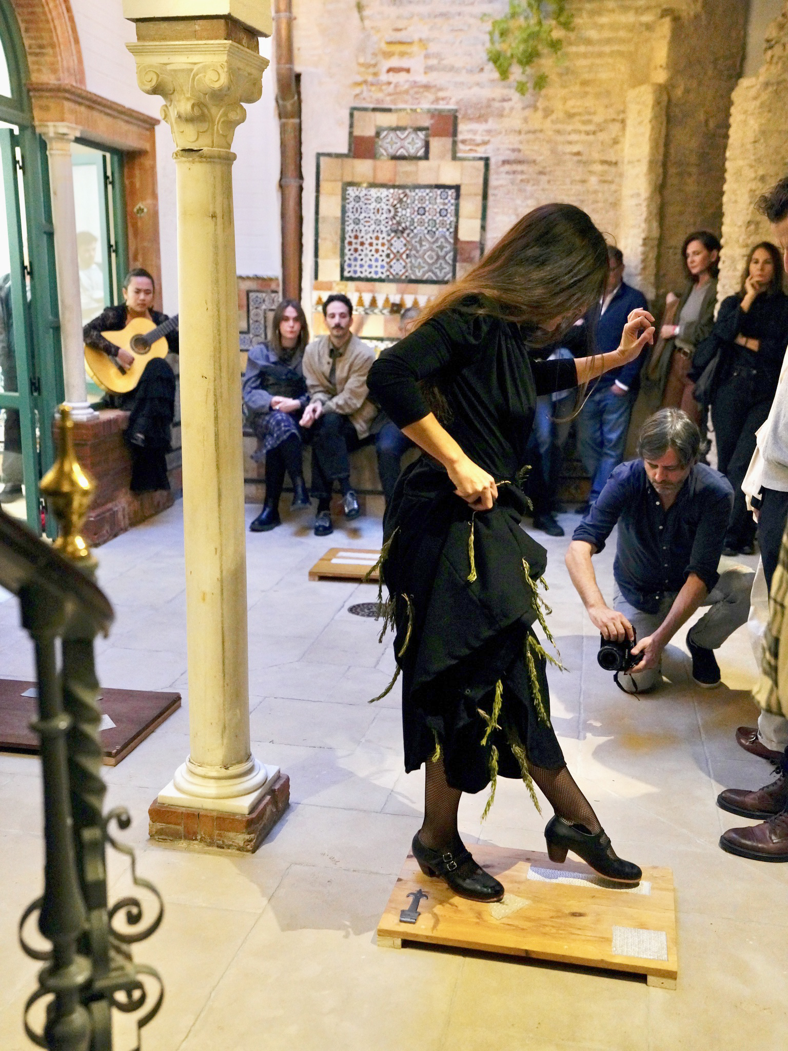 En su nueva exposición, Elena Jones presenta un conjunto de tablaos concebidos como instrumentos de suelo. A diferencia del soporte tradicional del flamenco, estas superficies se construyen con fragmentos urbanos —baldosas sueltas, trozos de concreto, restos industriales— recolectados durante sus recorridos por la ciudad. Cada pieza condensa una geografía de hallazgos y resonancias. Sobre ellos, una bailaora activará la obra con su taconeo, inaugurando la muestra a través de un acto sonoro y corporal que convierte el suelo en partitura. La falda de la intérprete, impregnada de romero y otras hierbas aromáticas, liberará su perfume durante la acción, integrando el olfato al compás. El espacio expositivo se transforma así en una cámara sensorial donde el golpe, la vibración y el aroma producen un registro de escucha expandida.